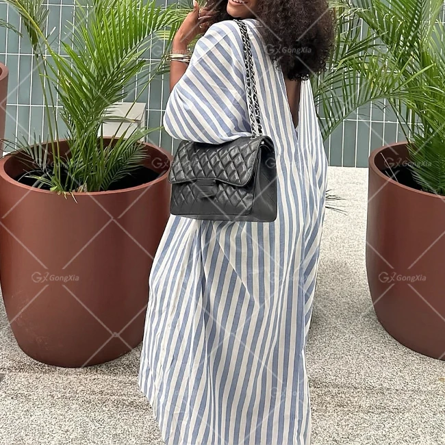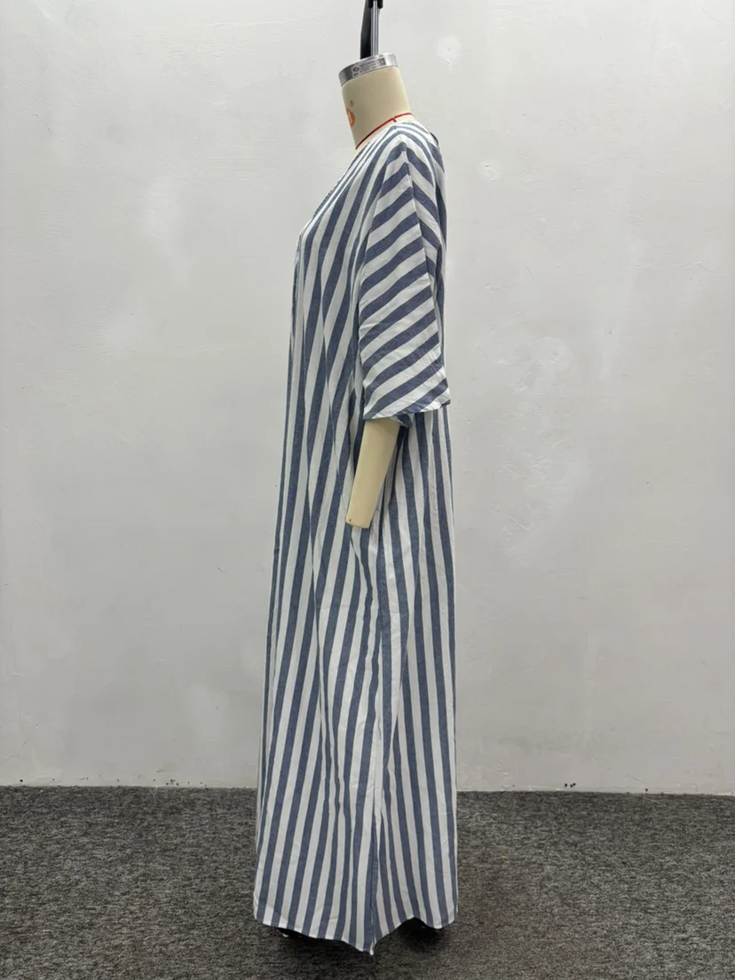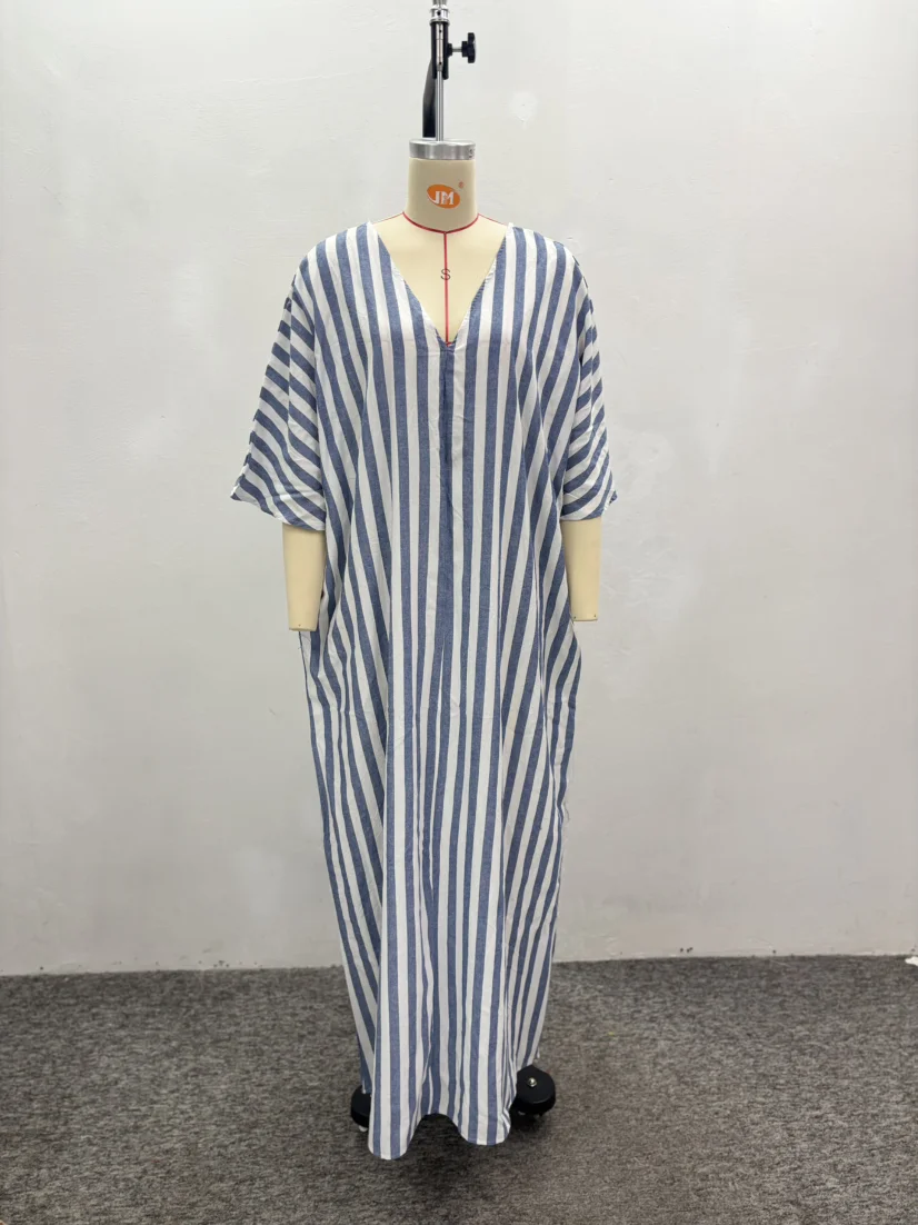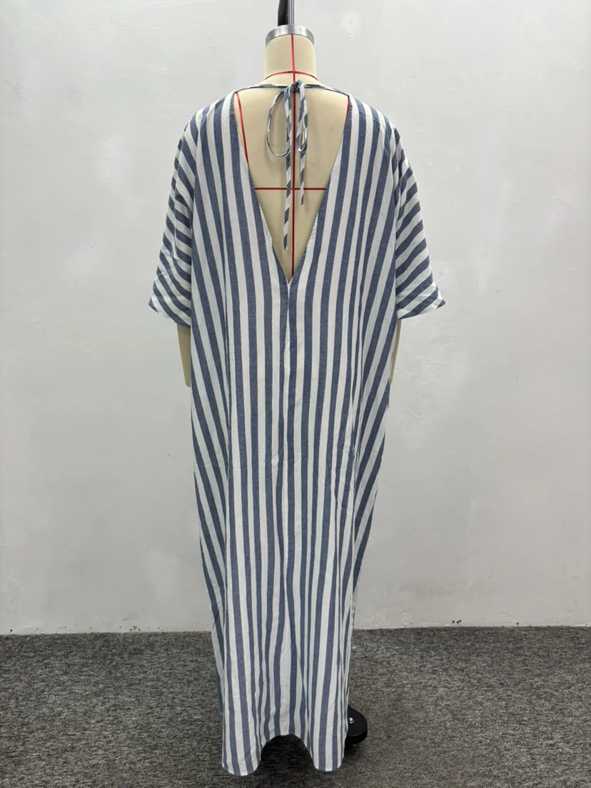 GX7245A Fashion Clothing Boutique Stripped Printed Short Sleeve Loose Long Dress Elegant Backless V-neck Maxi Dresses